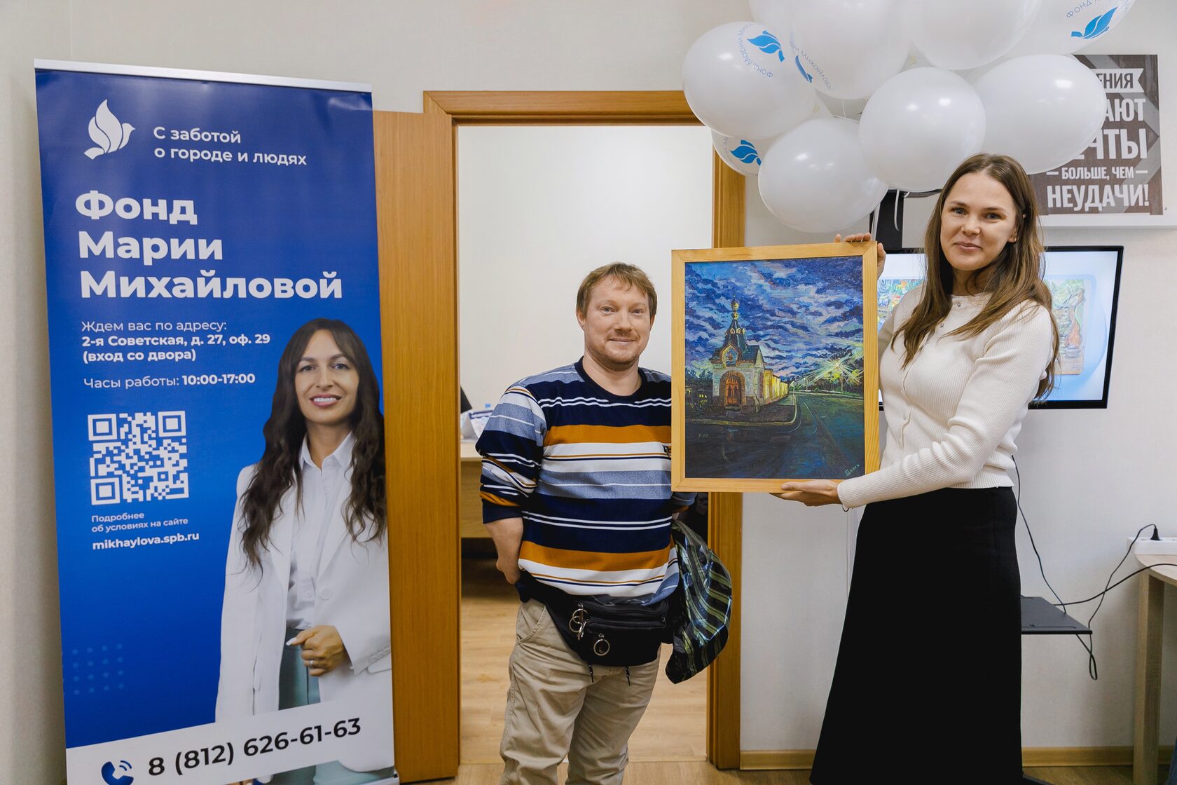 Важным гостем стал художник Иван Галаничев — один из друзей Фонда. У Ивана необычная и сложная судьба: молодой человек родился без кистей рук и был оставлен в доме малютки. Затем его перевели в детский дом для людей с инвалидностью. Несмотря на преграды и трудности, Иван сумел самостоятельно проложить свою дорогу к мечте. Он с детства любил рисовать — хобби переросло в карьеру и подарило Ивану известность. Теперь Ивана Галаничева поддерживает Фонд Марии Михайловой. В благодарность художник подарил организации одну из своих картин.